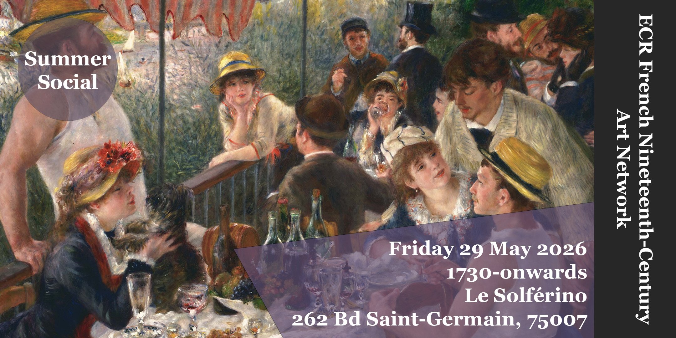 Join us on 29th May from 1730 onwards following the conclusion of the colloquium Revoir Renoir (held at the Musée d’Orsay, from 9h30 to 17h30) for the ECR Nineteenth-Century French Art Network summer social. Taking place near to the Musée d’Orsay at Le Solférino (262, bld Saint-Germain), we welcome anyone across all levels from ECR’s to professor emeritus' to meet familiar faces as well as new colleagues outside the more formal environment of the conference. So do join us for an evening drink! For further information please email info@ecrfrenchart.com or contact Matthew French or Oriane Poret direct.